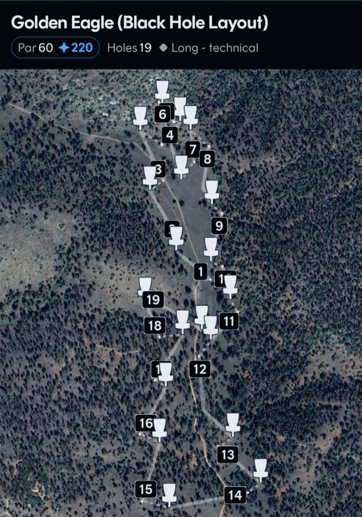 Golden Eagle layout (par 60)-A 19 basket course with many long technical shots. Some wide open, many with some fun obstacles. All shots are par 3 with the exception of #12, #14, and #15 being par four for a total par of 60 for this layout. This course is ever evolving at the moment though so this could change! This course is about 3 miles in walking distance and will have you busting a sweat.